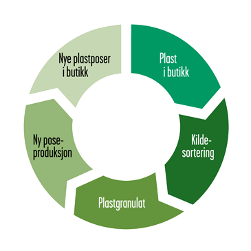 I våre butikker får vi masse plastemballasje, blant annet fordi varene kommer til butikk omslynget med en plastfilm, slik at varene unngår skade under transport. Denne plasten kildesorterer vi og sender fra oss til en renovatør som selger dette videre til produksjon av små plastkuler, som igjen brukes til produksjon av nye plastposer.