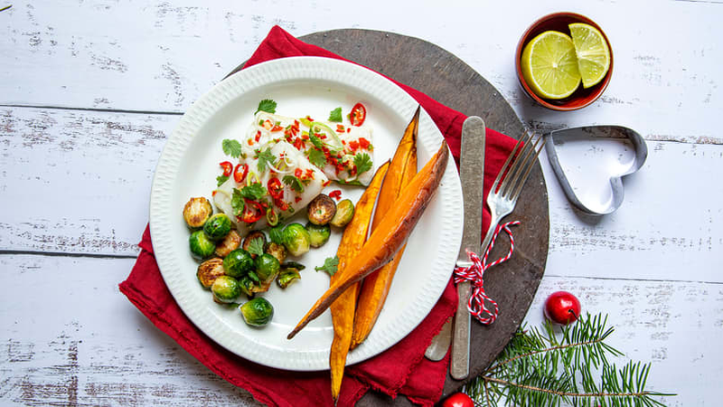 60+ min|MiddelsSpicy torsk med ovnsbakte søtpoteter