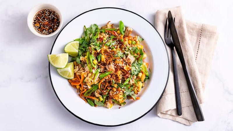 20 min|EnkelStekt ris med svinekjøtt, egg og bacon