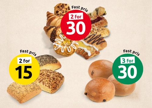 Hver dag gjennom hele året får du 3 for 30,- på nystekte hvete-, sjokolade- og rosinboller, 2 for 30,- på et utvalg wienerbakst og 2 for 15 på utvalgte rundstykker - alt stekt i våre butikker.