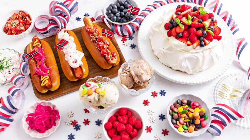 Og la oss ikke glemme deilige kaker og desserter - det hører også med til 17. mai. Is og bær kan være en enkel og frisk avslutning på måltidet, eller du kan slå til med å servere en flott festkake!