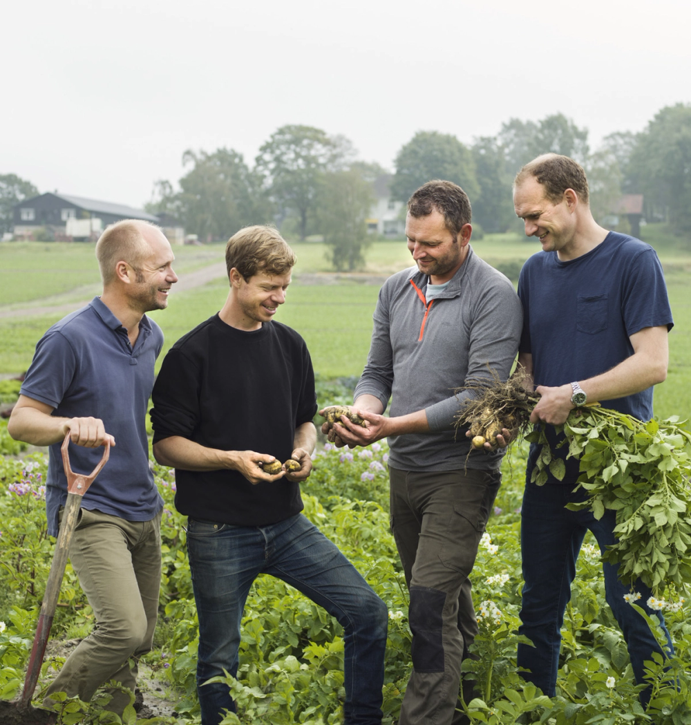 – Vi er et fellesskap av mennesker som er levende opptatt av jordbruk, mat og mennesker. Fellesskapet representerer to familier som har drevet landbruk i flere generasjoner, og i 2008 fusjonerte de to familievirksomhetene våre. De siste årene har produksjon og utvikling av delikatessepoteter vært viktig for oss, og det har blitt satset intenst på utvikling av nye poteter, forklarer daglig leder Åsmund Bjertnæs.